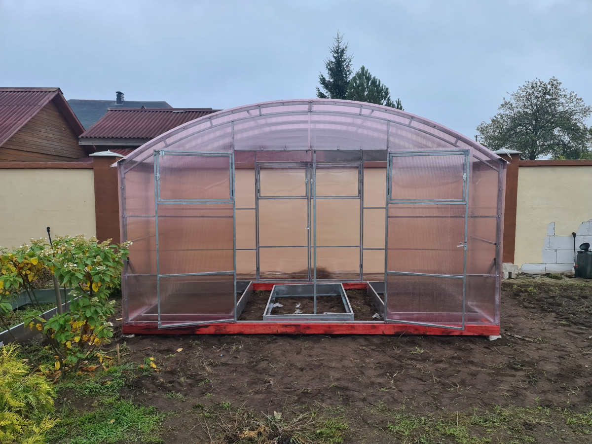 • широкая 4 м, ширина теплицы позволяет организовать 3 широкие полноценные грядки с комфортными проходами между ними;